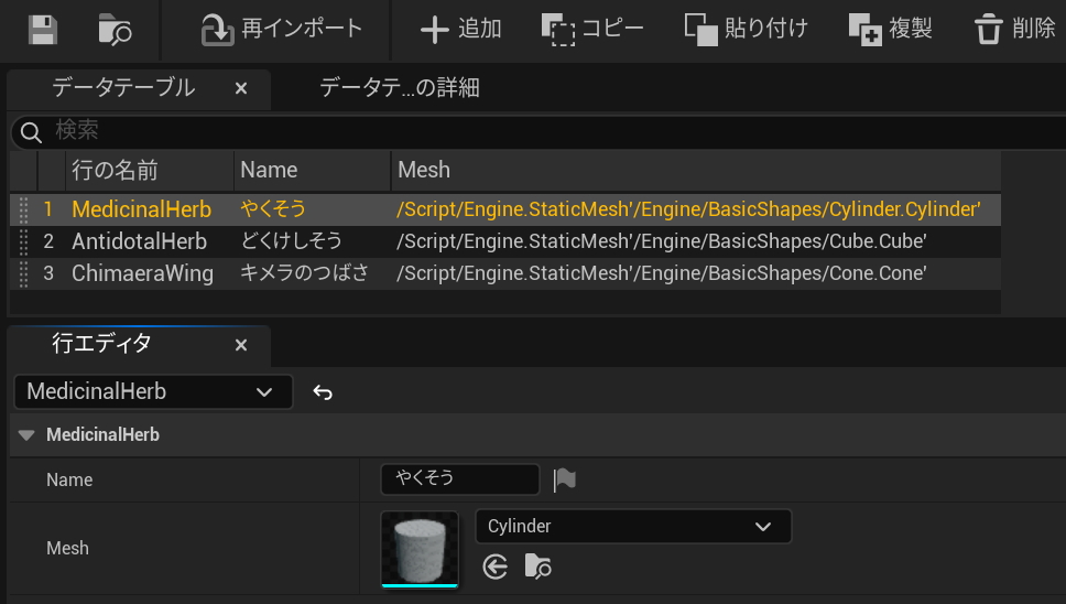 さきほど作成した構造体を用いて「やくそう」「どくけしそう」「キメラのつばさ」などのアイテムを設定するのがデータテーブルです。