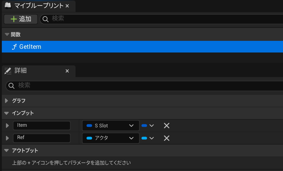 そうするとマイブループリントの欄に インターフェース > GetItemが追加されます。