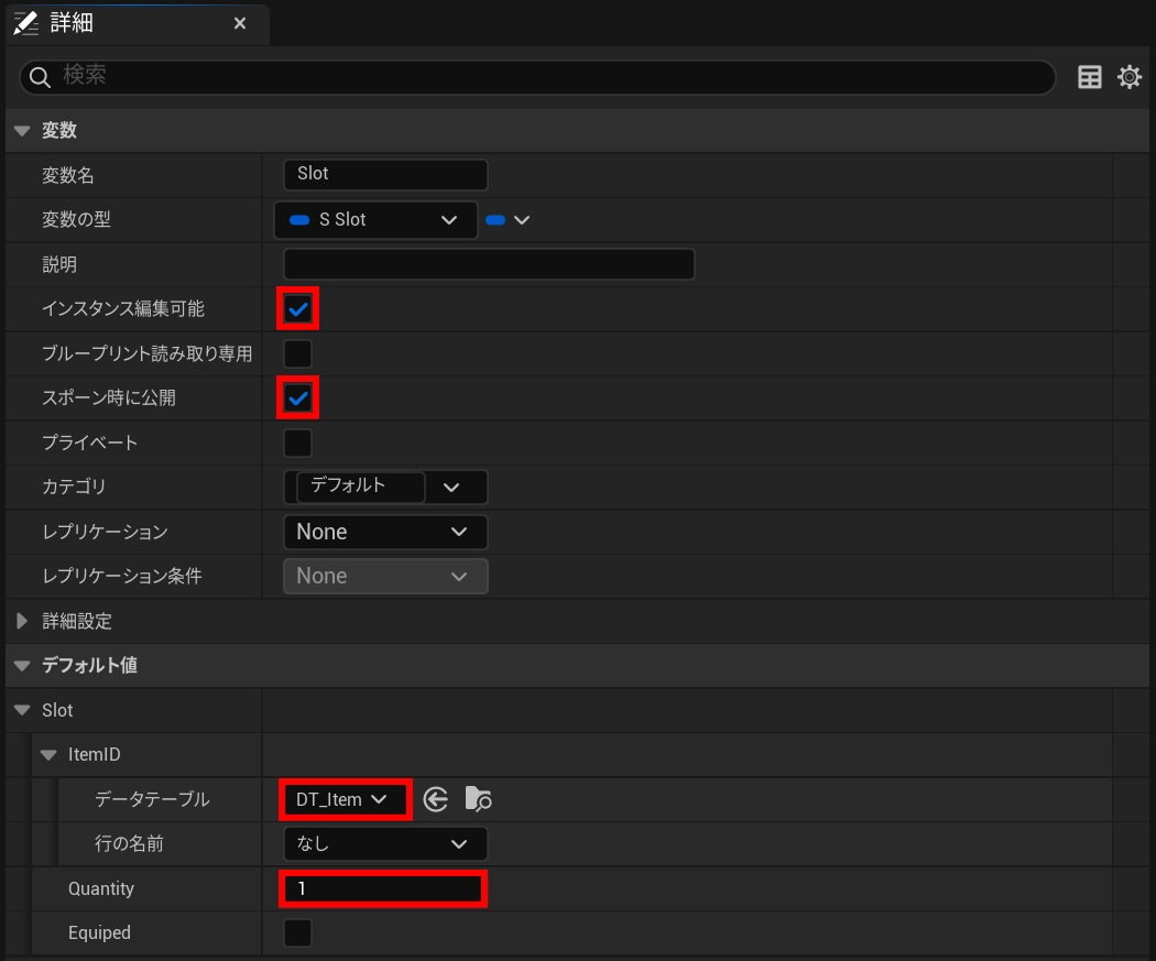 ・詳細の「インスタンス編集可能」と「スポーン時に公開」にチェックを入れる。「インスタンス編集可能」にチェックを入れていると、レベルに配置してからこのアクタが何のアイテムであるかを設定できます。