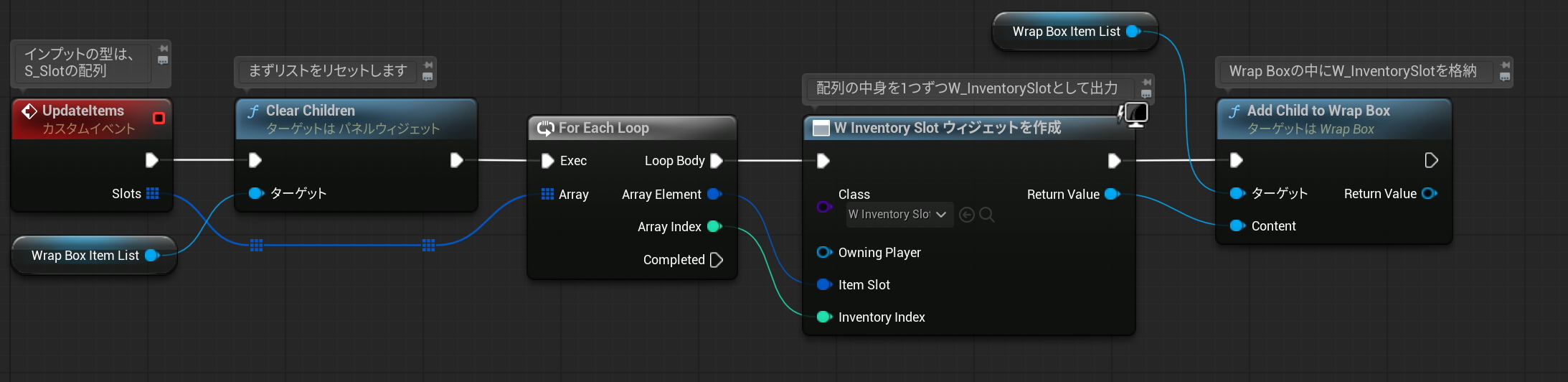 ・カスタムイベント UpdateItemsのインプットは、Slots – S_Slot※配列です。このイベントは、アイテムを入手したタイミングで起動させることになります。