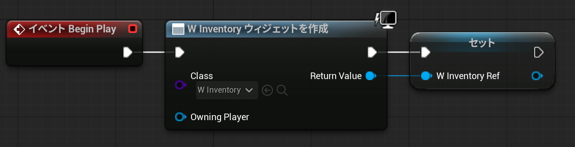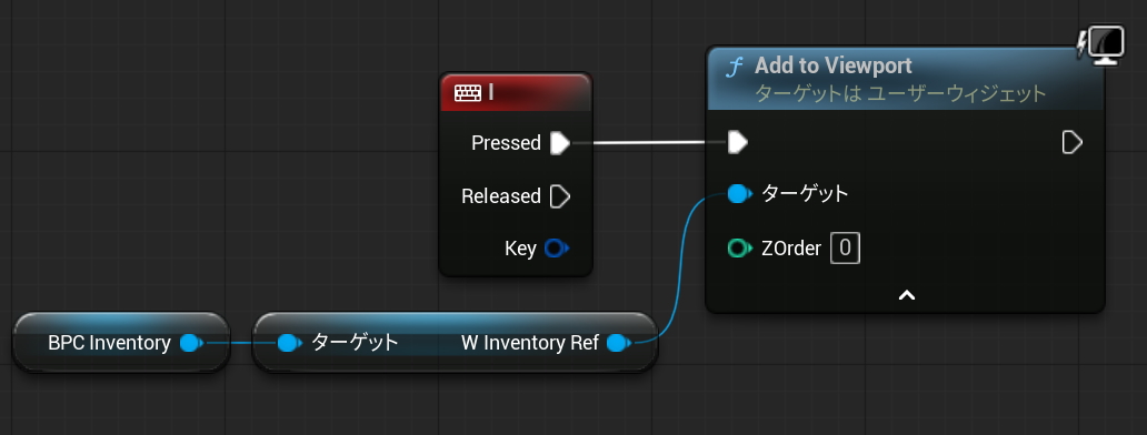動作テストとして、簡易的にIキーでインベントリUIを表示させます。
