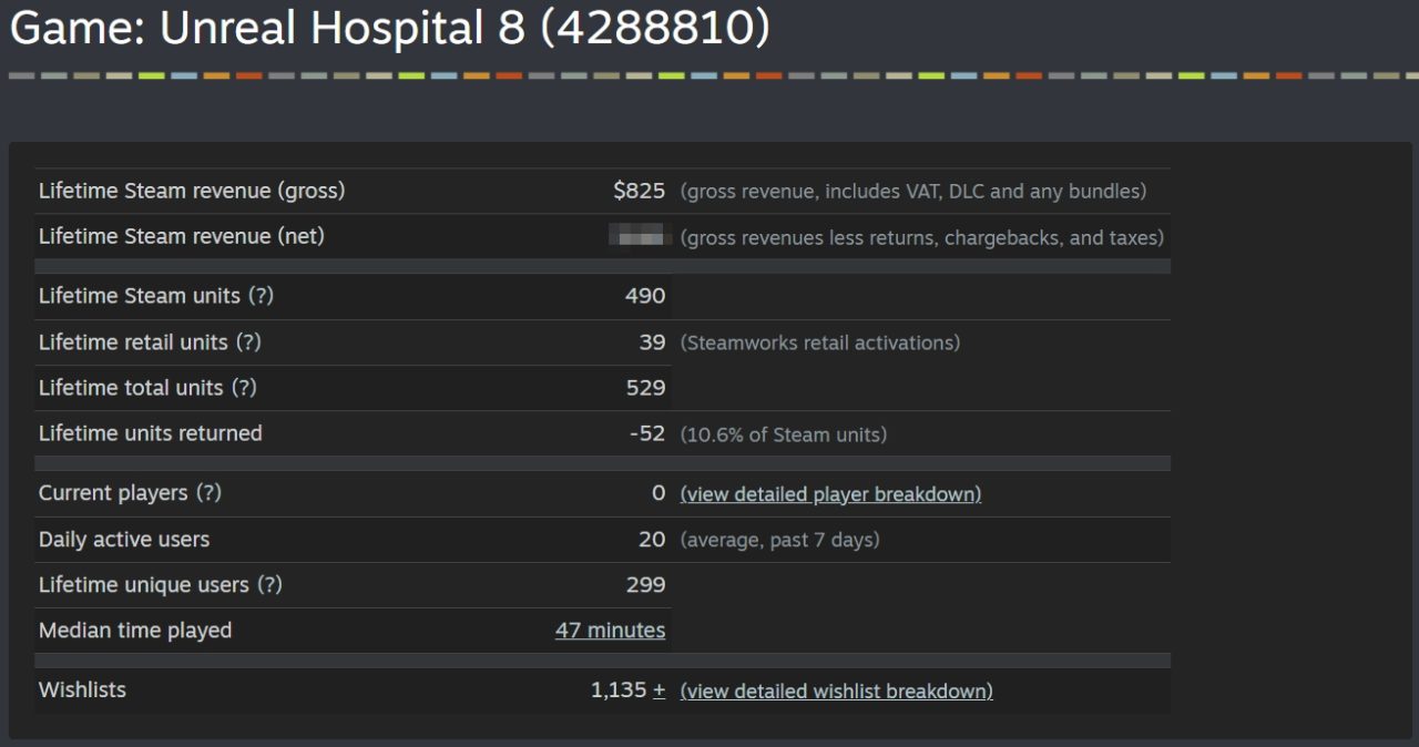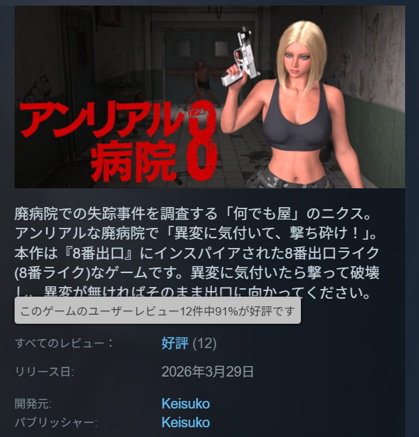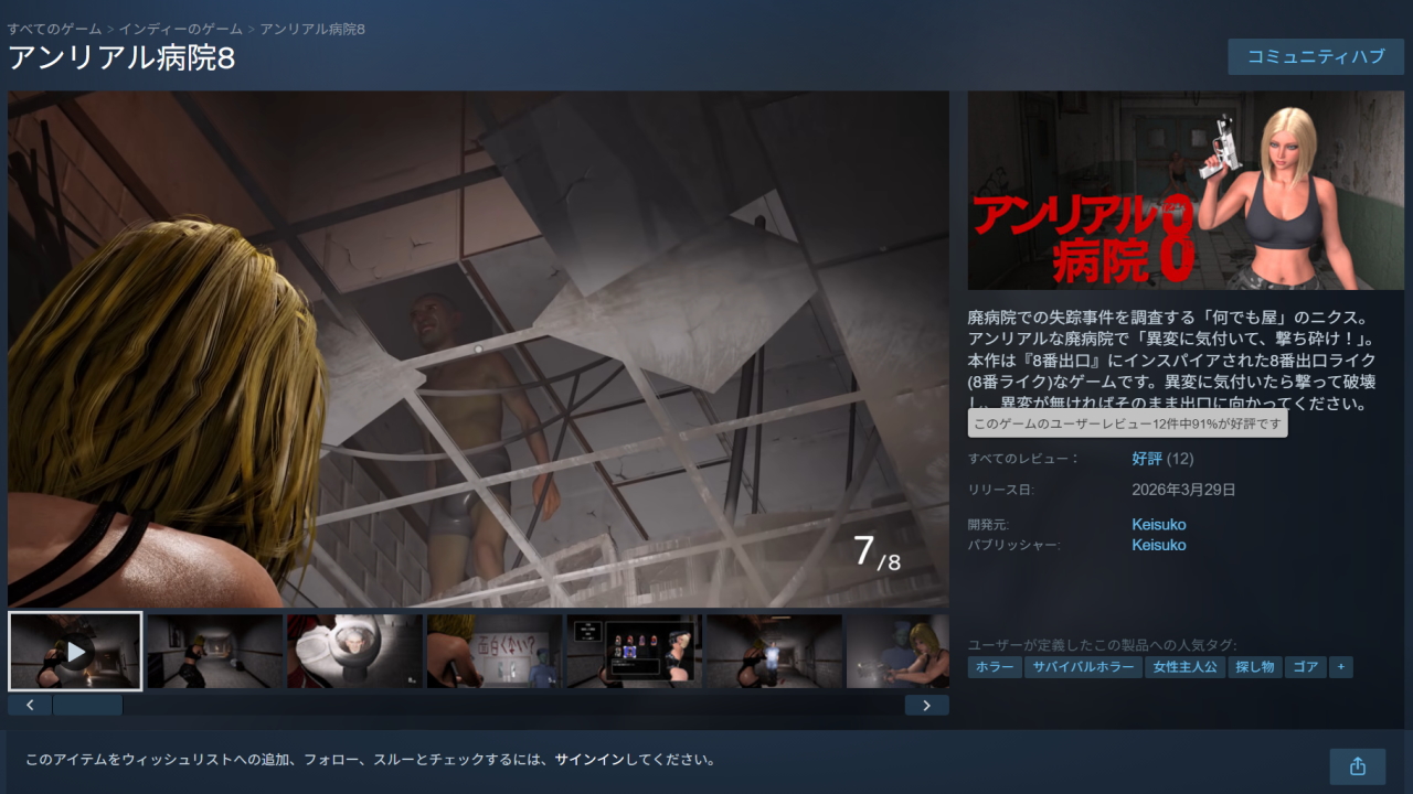 2026年3月30日(月)にSteamでリリースした『アンリアル病院8』の販売結果報告です。