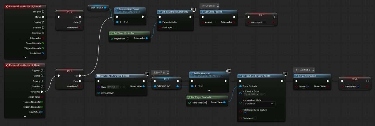 ・EnhancedInputAction IA_MenuはCompletedから実行ピンを繋いでいます。これはYボタンを離した時に実行されるようになっています。