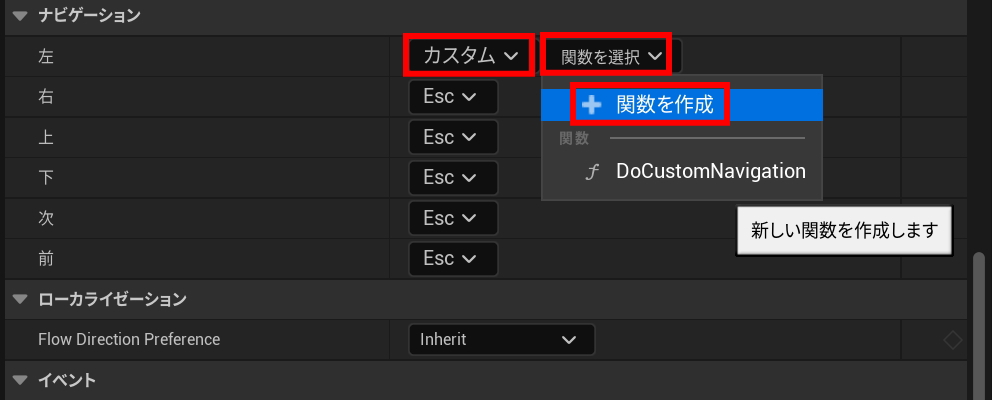 Button_Itemを選択し、詳細の ナビゲーション > 左 > カスタム > 関数を作成 を選択。