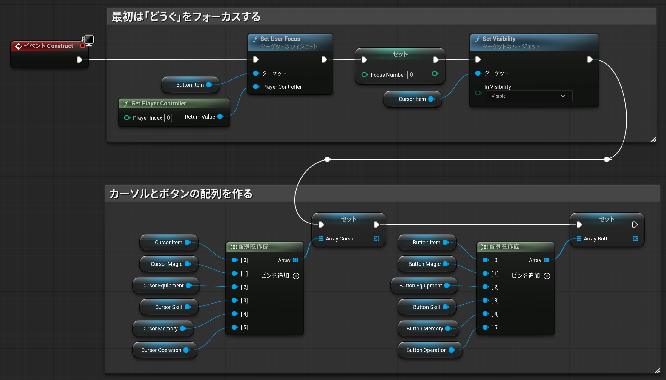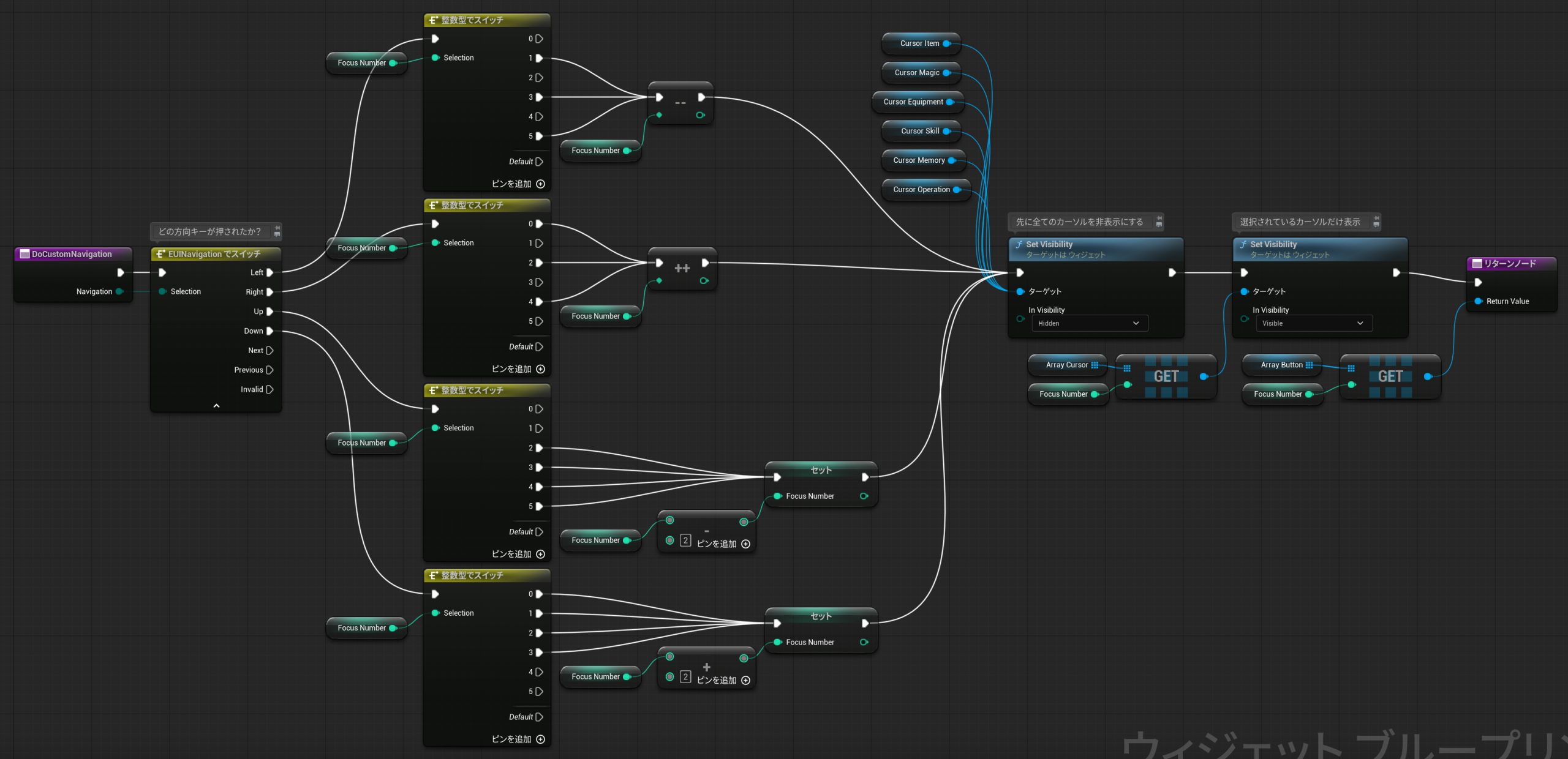 EUINavigationでスイッチのDownの実行ピンの先を見ると、現在のFocusNumberが0であった場合、+2する設定になっています。これにより2の「そうび」を選択させることができます。