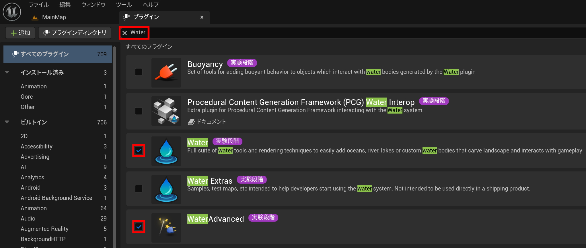 UE5.6に最初から入っていますが、手動で有効化する必要があります。 - プラグイン: Water Advanced