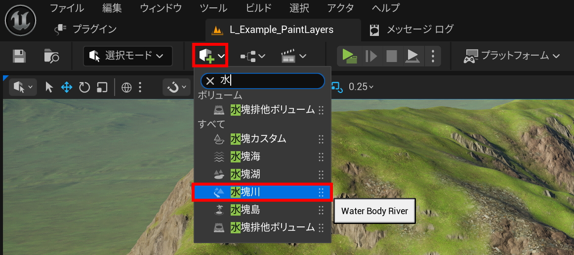 上メニューの■+アイコンをクリックして、検索欄に「水」と入力してから水塊川を選択。