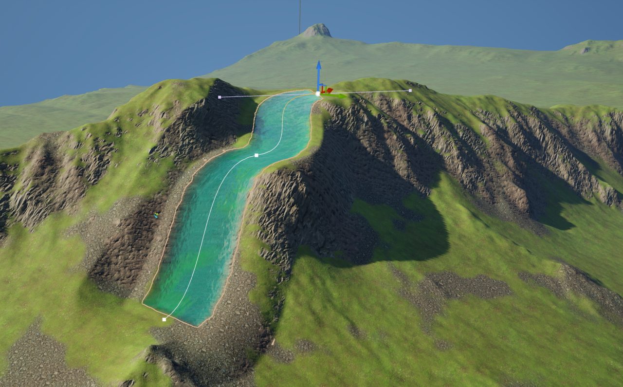 注意点として、この後の作業でシミュレートした時に「最初のスプライン ポイント」から水が発生して川が流れます。「最初のスプライン ポイント」が下流になってしまうと、川に水が流れず下流に水が溜まるようになってしまいます。