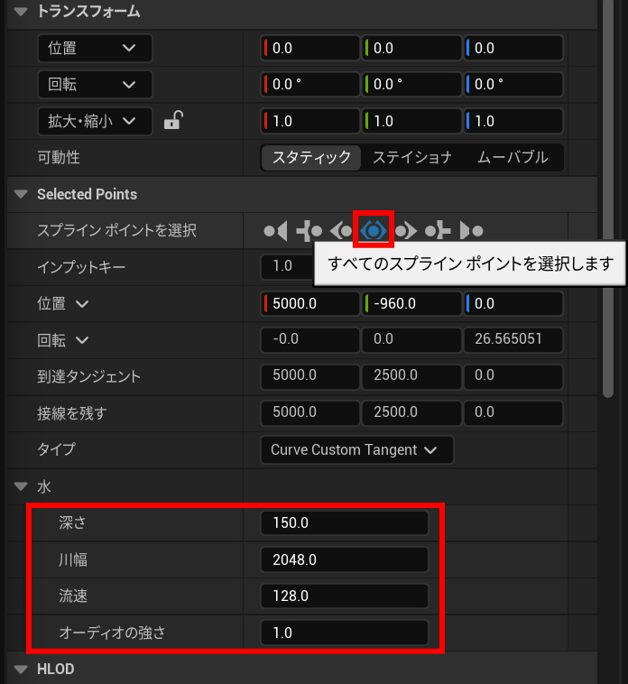Level上のスプラインポイントを選択し、詳細の 水 を見ます。