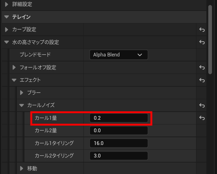 詳細の テレイン > 水の高さマップの設定 > エフェクト > カールノイズ を見ます。