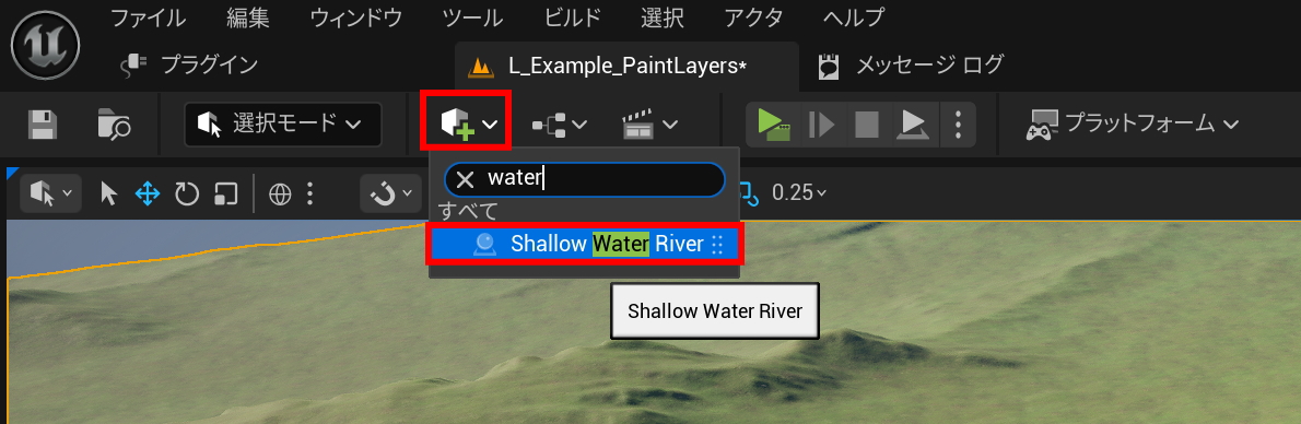 上メニューの■+アイコンをクリックして、検索欄に「water」と入力してからShallow Water Riverを選択。
