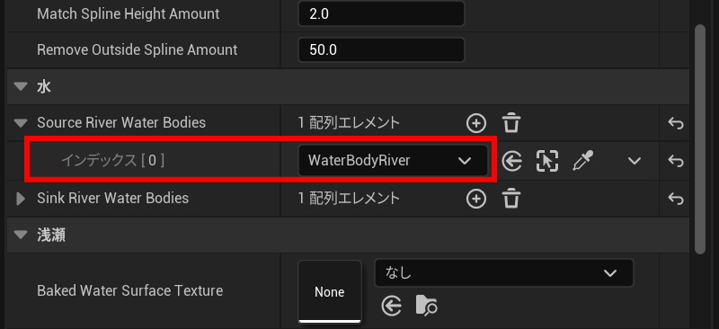 ShallowWaterRiverが選択されている状態で、詳細の 水 > Source River Water Bodies を見ます。