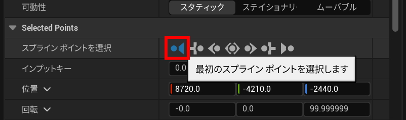 WaterBodyRiverを選択し、詳細の Selected Point > スプライン ポイントを選択 の左端のアイコンをクリックすれば「最初のスプライン ポイント」が選択されます。