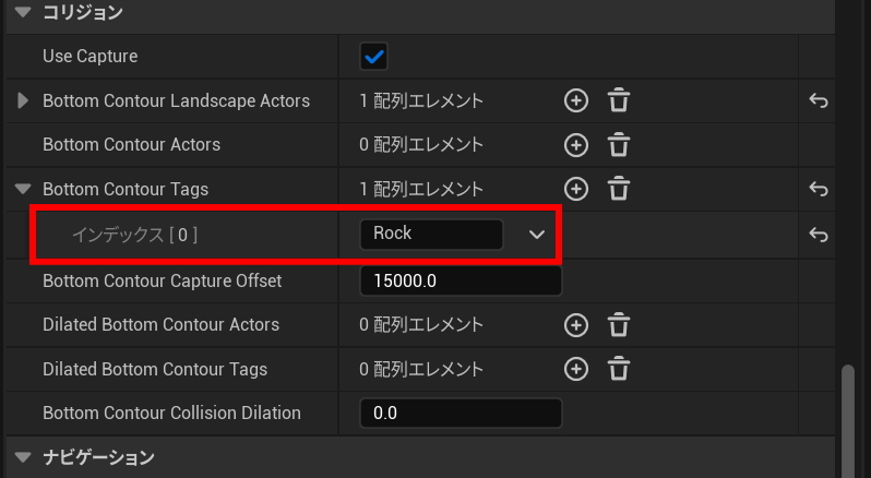 Shallow Water Riverが選択されている状態で、詳細の コリジョン > Bottom Contour Tags を見ます。