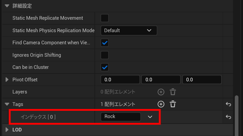 配置したスタティックメッシュを選択し、詳細の アクタ > 詳細設定 > Tags にRockというタグを追加します。