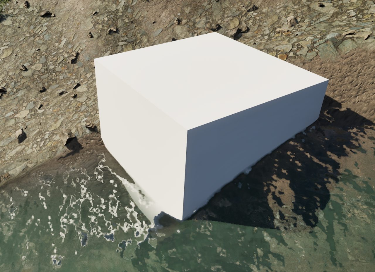 シミュレーションした時に水が溢れる問題も、部分的ならスタティックメッシュを岸に追加して岸を高くすれば解決できます。