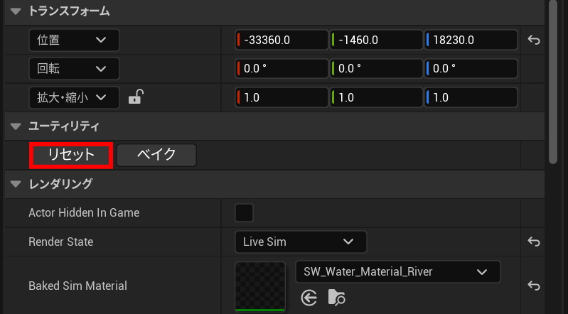ShallowWaterRiverが選択されている状態で、詳細の レンダリング > Render State が「Water Component with Baked Sim」になっているのを確認。