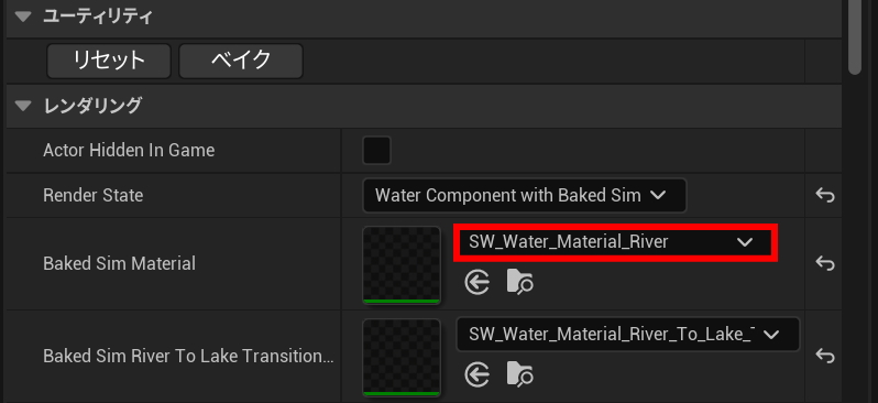 ShallowWaterRiverが選択されている状態で、詳細の レンダリング > Baked Sim Materialを見ます。